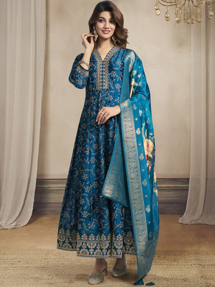 Blue Floral Embroidered V-Neck Anarkali Kurta With Trousers & Dupatta