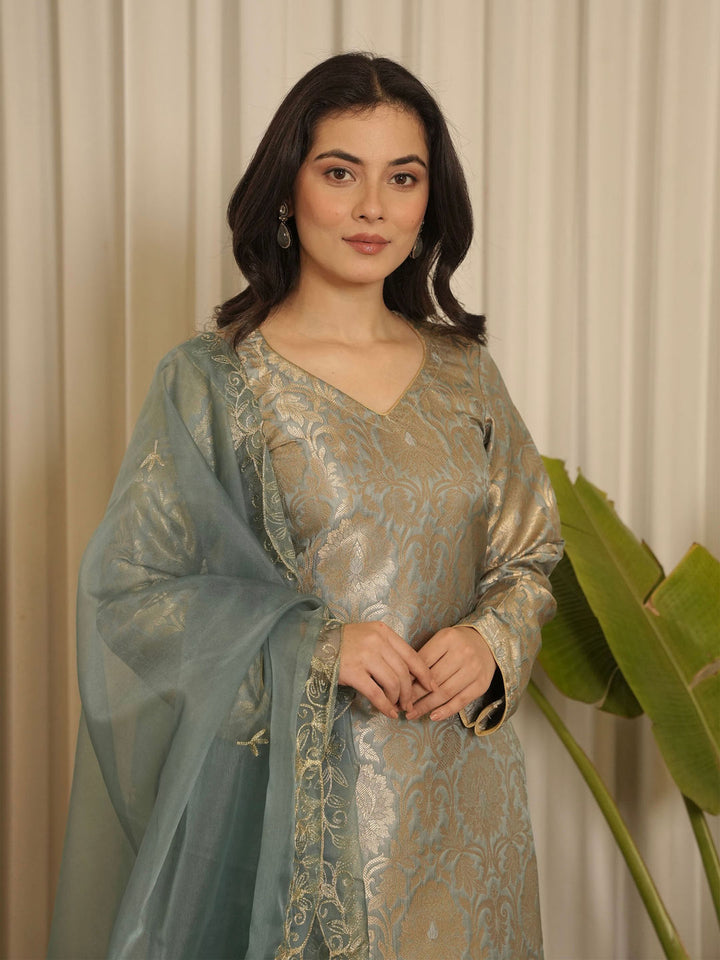 Grey Brocade Floral Kurta with Pant & Dupatta (Set of 3)