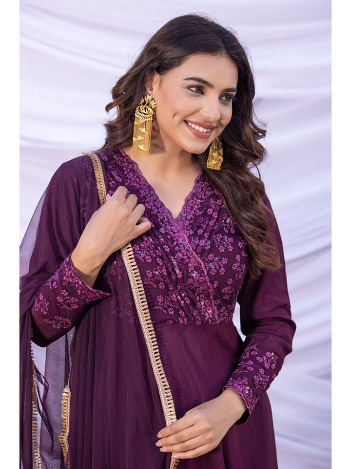 Purple Lace Embroidered Anarkali Kurta with Pant and Dupatta (Set of 3)