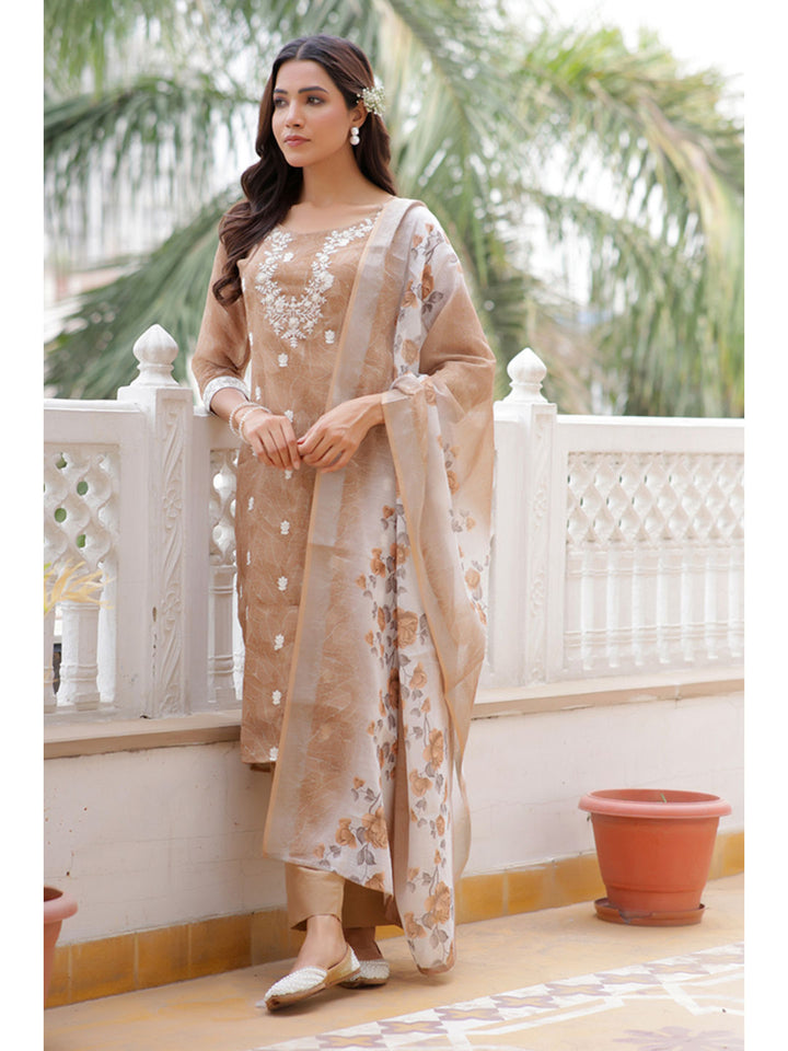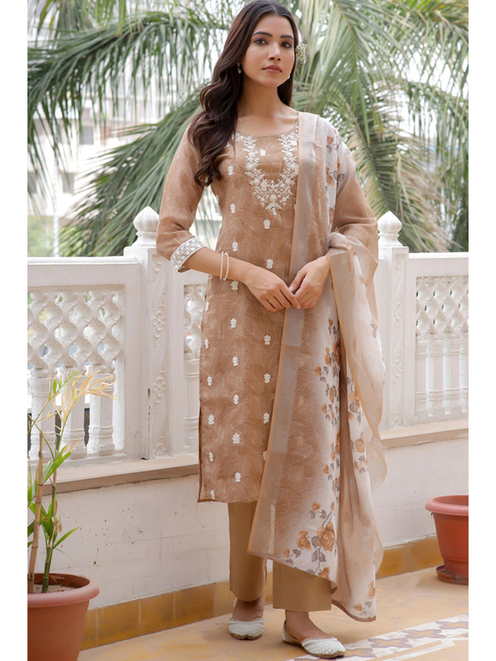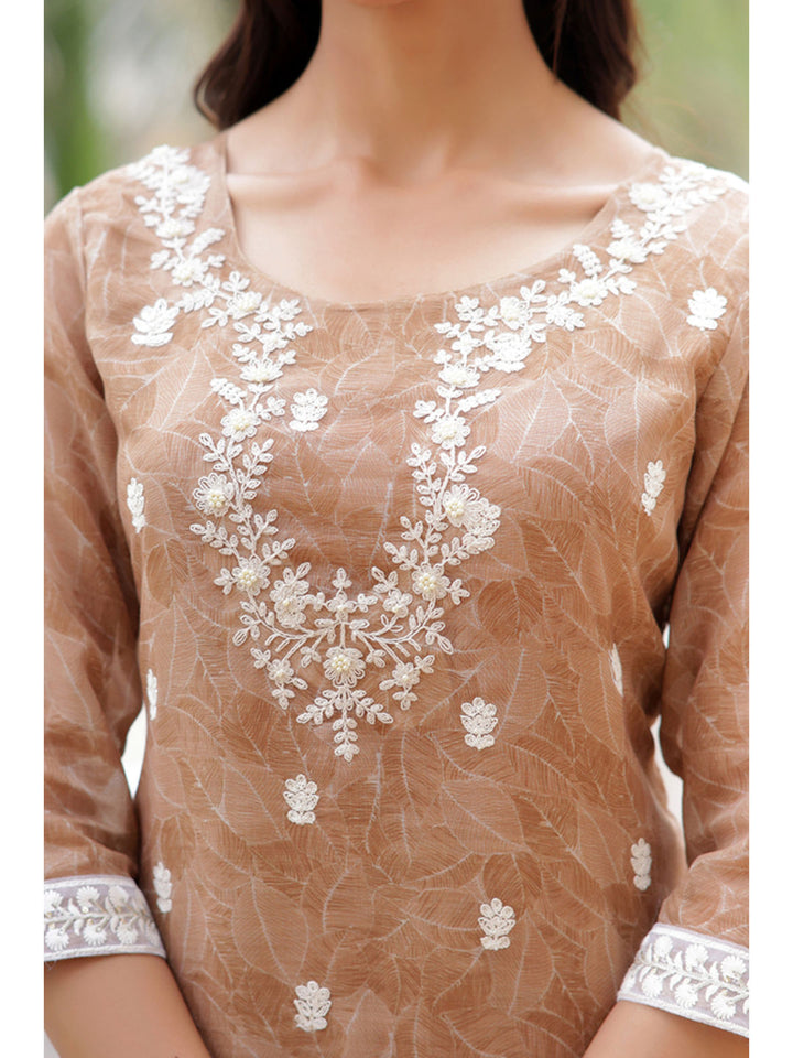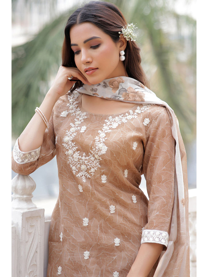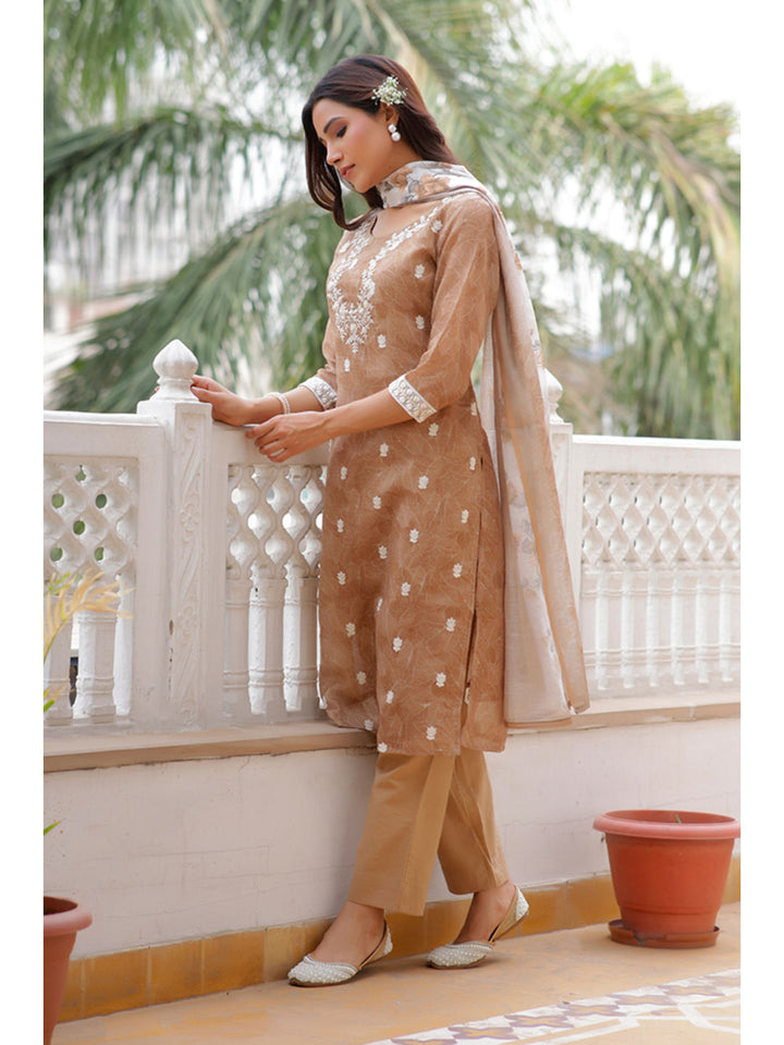 Women Brown Linen Embroidered Kurta with Solid Pant and Dupatta (Set of 3)