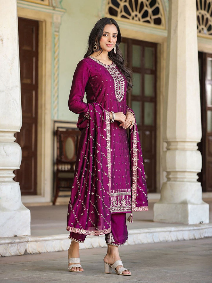 Women Burgundy Silk Blend Ethnic Motifs Embroidered Kurta Pant with Dupatta (Set of 3)